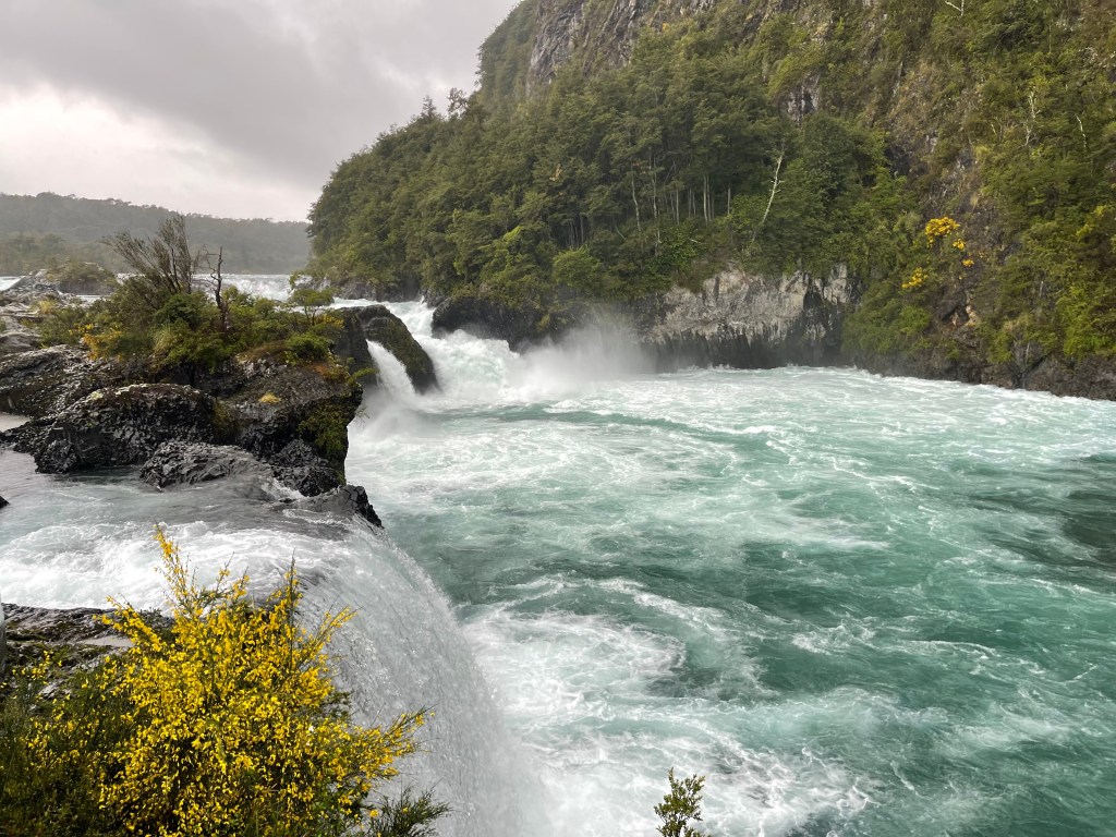 Today we spent a lot of time traveling around the lake to visit Vicente Pérez Rosales National Park which is Chile’s oldest national park established in 1926. This park is special as the river flows through cinder cones, volcanic peaks and lava flows. A very wet walk took us down to the dramatic Petrohué Falls. We wondered if our young kayak adventure friend, Jordan, might attempt this but we were assured by our guides that no one survives that drop due to the razor-sharp volcanic rock!