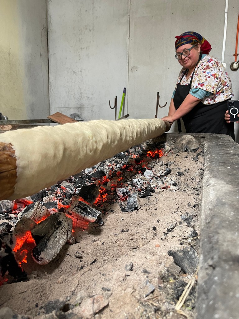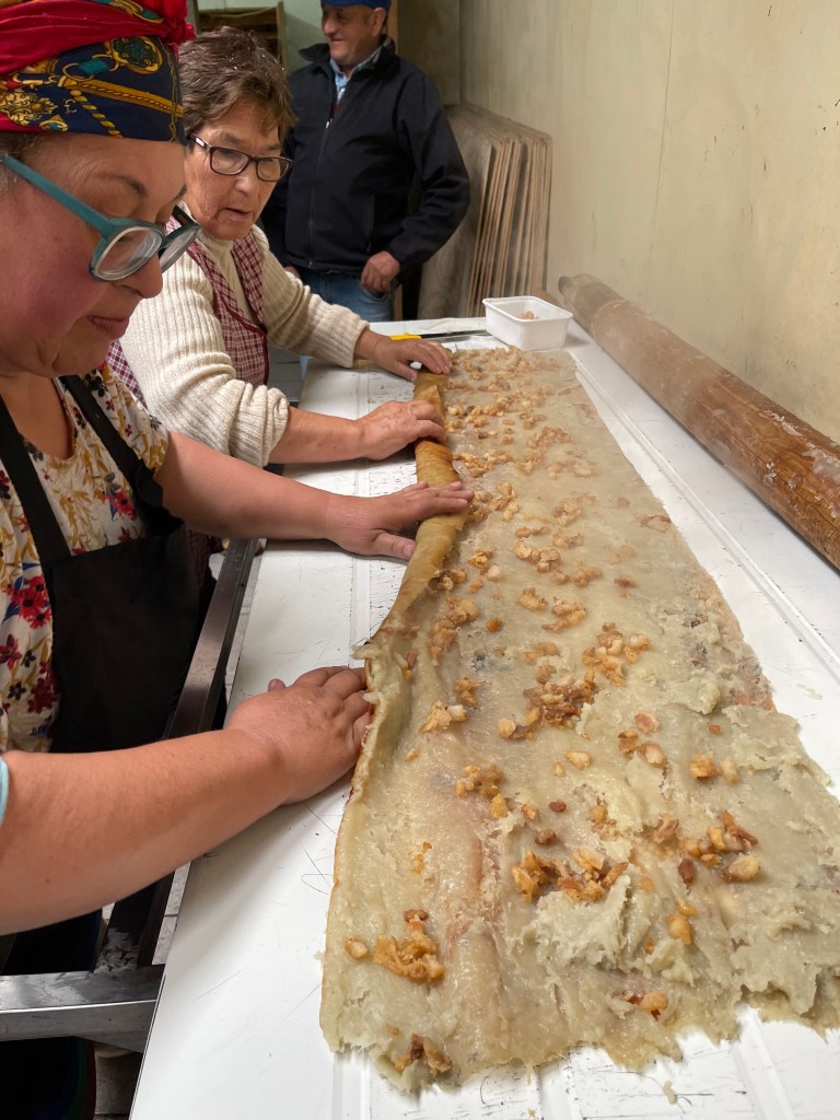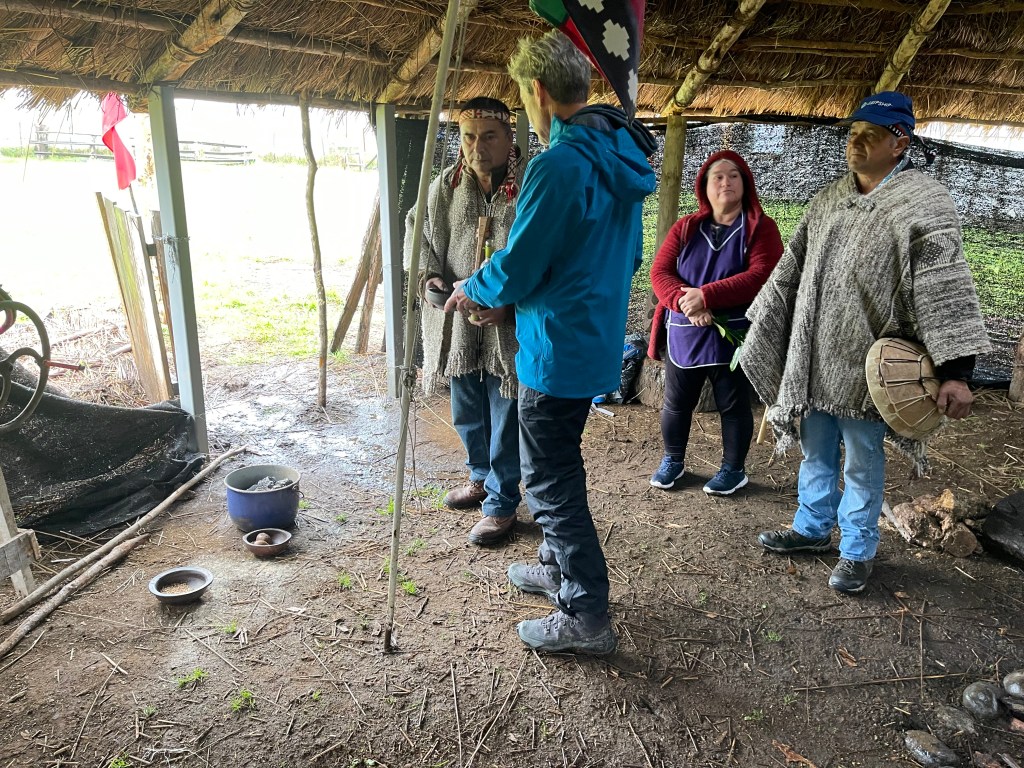 From the Falls we headed south to the Pacific coast where we were welcomed by a local indigenous community of Huilliche (People of the South), the southernmost population of Mapuche people. We participated in a traditional ceremony where we gave thanks both publicly and privately to Mother Earth for all that she provides to us. The community came together and walked us thru a traditional way of cooking potatoes from their fields which was to pat the mashed potato (with a large amount of lard from what I could tell) on to a wood pole. Once the potatoes were on the pole we moved it over a very hot bed of coals and rotated the pole for about 30 minutes. They then cut the potatoes off and sprinkled cracklings and re-rolled the potatoes, sliced it into rounds and we had a very decadent potato dish – which the chief (Lonko) insisted was better than “McDonalds”. Lunch consisted of a hunk of smoked pig from a member of the community and some vegetables – and of course Chilean wine!